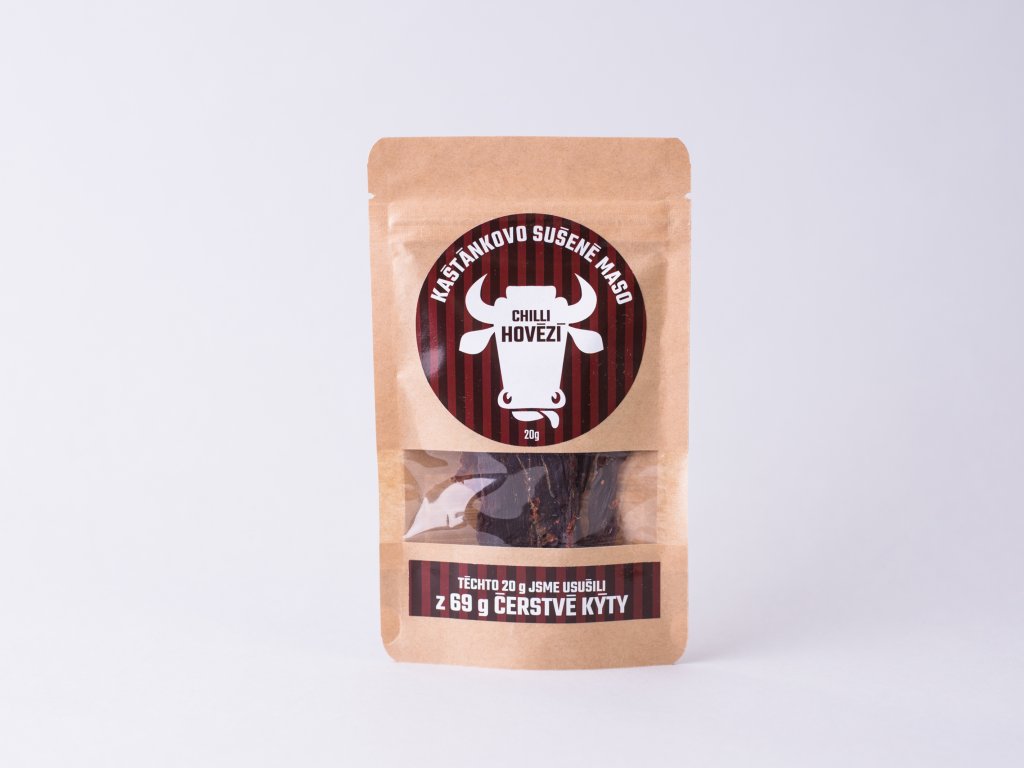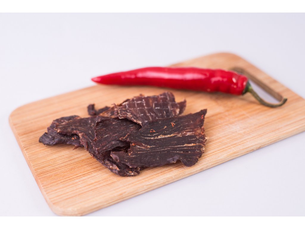 Sušené hovězí maso marinované v sojové a worcesterové omáčce s čerstvými chilli papričkami. Maso po usušení není příliš ostré, u nás klademe důraz na chuť.