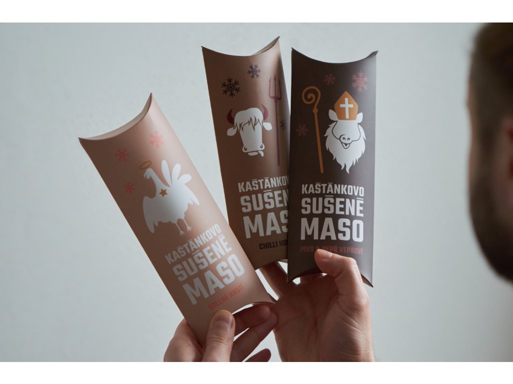 Tento balíček obsahuje tři pečlivě graficky vytvořené krabičky po 50 g sušeného masa:
