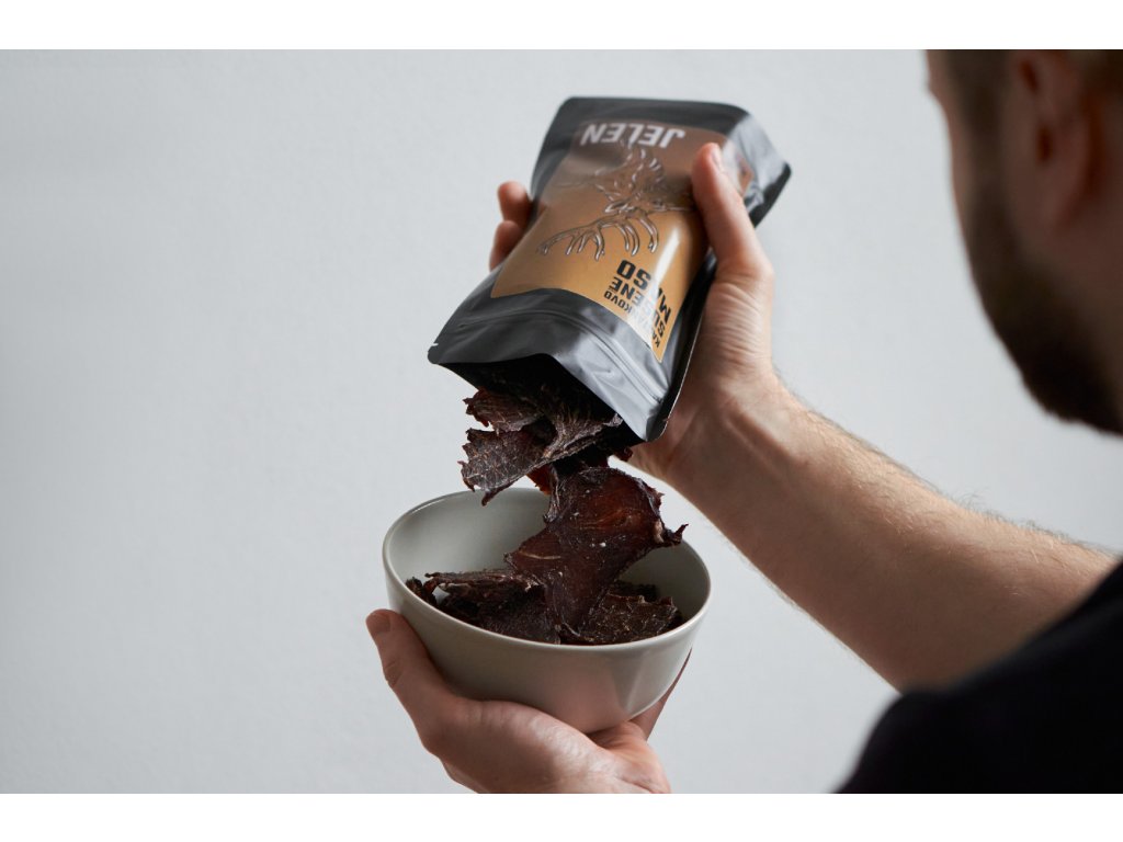 Složení: jelení maso 88,5%, červené víno 9,5%, jedlá sůl 1,25%, rozmarýn 0,38%, jalovec 0,37%.